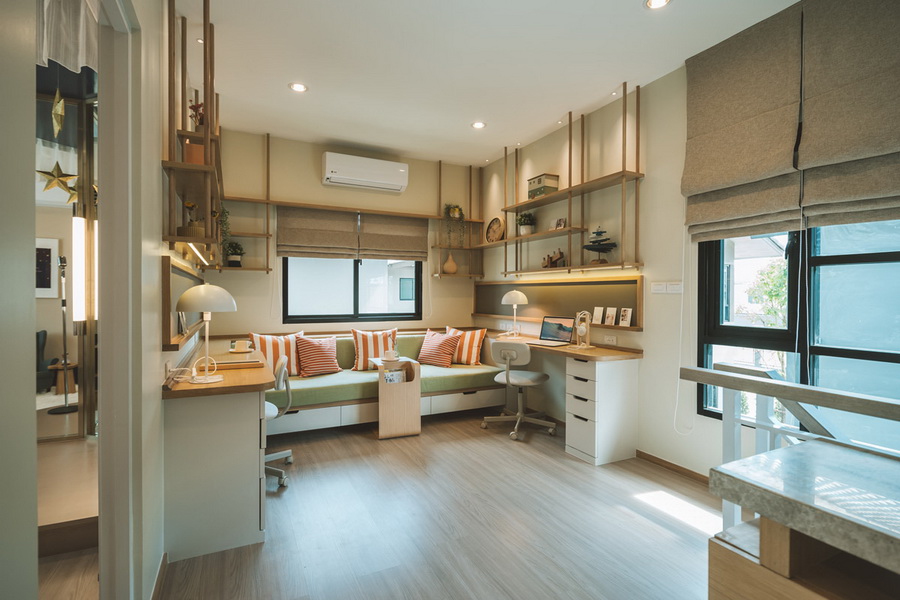 แบบบ้านตัวอย่างด้านในบ้าน มีการเล่นวัสดุไม้เป็นลวดลายตารางตามแบบฉบับบ้านสไตล์ญี่ปุ่น พร้อมกับใช้เฟอร์นิเจอร์ไม้ให้ดูมีความเป็นธรรมชาติ หากใครชอบแบบนี้ก็สามารถแต่งตามบ้านตัวอย่างได้เลยค่ะ