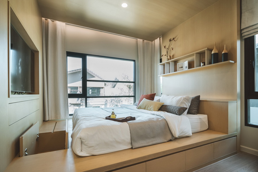 และที่โดดเด่นเลยคือฐานเตียงแบบเตี้ยสไตล์ญี่ปุ่น พร้อมลิ้นชักเก็บของได้ด้วย ชอบมากค่ะมุมนี้