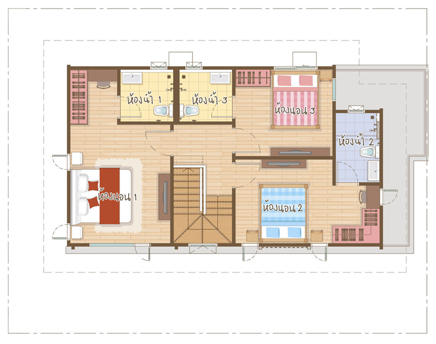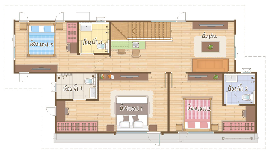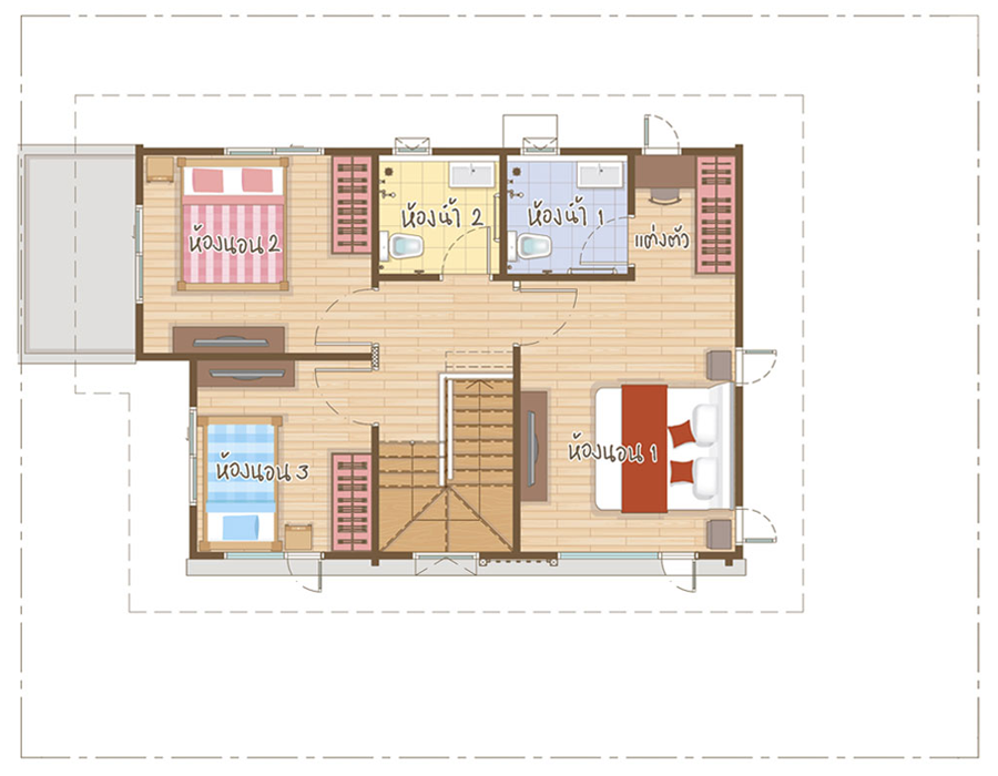 จากแบบบ้านจะเห็นได้ว่า เขาใช้สีบ้านเป็นสีเอิร์ธโทนตามหลักบ้านญี่ปุ่นเลยค่ะ แต่ดีไซน์อาจจะมีการปรับให้ดูโมเดิร์น แต่ก็ยังแฝงไปด้วยกิมมิกแบบญี่ปุ่นด้วยระแนงไม้เป็นลูกเล่นสวยๆ ส่วนภายในแปลนบ้านก็มีการผสมผสานให้เข้ากับการใช้ชีวิตของคนไทย ในบรรยาากาศแบบญี่ปุ่นๆ นั่นเองค่ะ
