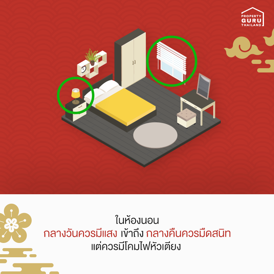 ห้องนอนเป็นห้องที่เราใช้พักผ่อน ชาร์ตพลังให้ชีวิตพร้อมที่จะสู้กับวันใหม่ ดังนั้นกลางวันควรสว่างไสว ระบายอากาศและรับแสงได้ดี และกลางคืนก็ควรมืดสนิท แต่ควรมีโคมไฟหัวเตียง เพราะจะช่วยให้ชีวิตกระจ่าง สว่างสดใส นำไปสู่ทางที่ดีๆ อีกทั้งเวลาเล่นโทรศัพท์ช่วงกลางคืนหรือตื่นมาเข้าห้องน้ำก็จะได้ไม่ชนของต่างๆ แต่พอปิดแล้วควรมืดสนิท ความมืดจะช่วยให้หลับสนิทไม่ฝันร้าย