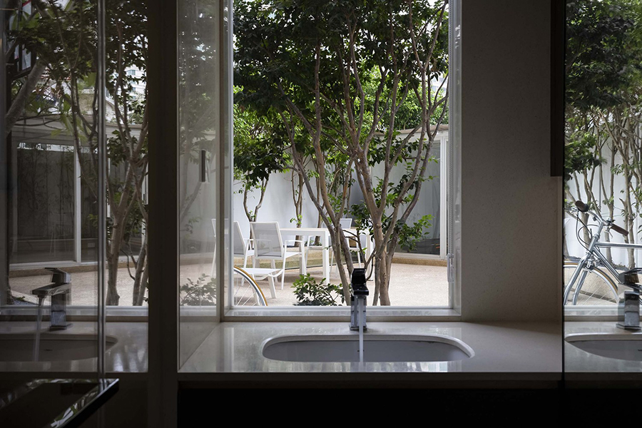 ภายนอกเป็นสีขาวล้วน แสงด้านในช่วยให้บ้านดูอบอุ่น จักรยานโบราณเหมือนที่อากงใช้สมัยวัยรุ่นก็จอดอยู่ ให้อากงยิ้มออกได้บ้างเมื่อมองไปเห็น