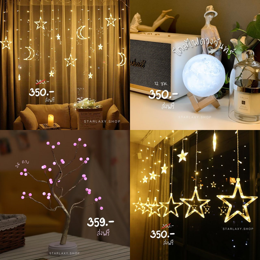 เพิ่มบรรยากาศความโรแมนติกให้กับห้องด้วยโคมไฟน่ารักๆ หลากหลายแบบ ใช้แสงสีส้มนวลสบายตาจากร้าน starlaxy.shop เป็นร้านที่ขายโคมไฟดวงดาว ไฟตกแต่งห้อง น่ารักๆ ออนไลน์ผ่าน IG มีหลากหลายแบบให้เลือกสรรค่ะ ทั้งรูปดวงดาว พระจันทร์ แบบตั้งโต๊ะ และแบบห้อยติดกับผนัง น่ารักๆ ทั้งนั้น ราคาก็ไม่แรงด้วยค่ะ เริ่มต้นที่ 100 กว่าบาท แถมยังส่งฟรีอีกด้วยค่ะ