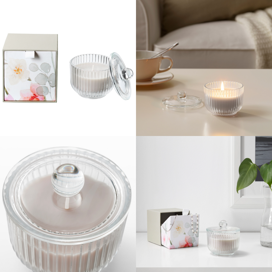 ถ้าแบบง่ายๆ เลยก็อาจจะเลือกซื้อเป็นเทียนหอมเก๋ๆ ก็ได้ค่ะ บางคนก็อาจจะชอบความละมุนของแสงสีส้มจากเทียน อบอวลไปด้วยกลิ่นหอมจากดอกแกลดิโอลัสผสมกลิ่นอายของผลไม้รสเปรี้ยวและดอกลิลลี่ อีกทั้งยังดีไซน์ได้สวยงาม ประดับตกแต่งห้องยิ่งทำให้ดูเก๋ไก๋ ตัวเทียนสามารถใช้งานได้นาน 20 ชม. เมื่อเทียนจนหมดแล้ว สามารถนำแก้วพร้อมฝาไปใช้เป็นที่เก็บของเล็กๆ น้อยๆ หรือใช้เป็นที่วางเทียนต่อได้อีกด้วยค่ะ ตัวนี้มีขายที่ Ikea ราคา 249 บาท