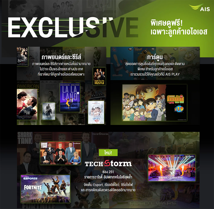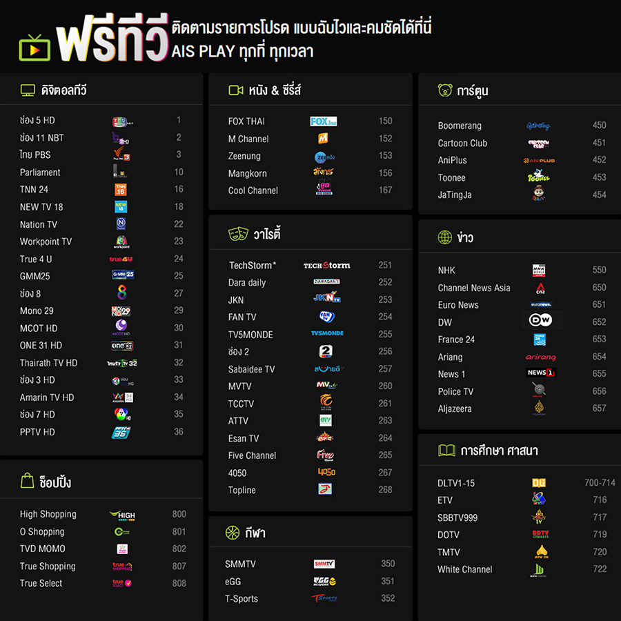สำหรับ AIS นั้นมีทีวีดิจิตอลที่เรียกว่า AIS Play สามารถรับชมช่องพื้นฐานได้ฟรีจากทุกเครือข่าย จากหลายช่องทางด้วยกัน เช่น แอปพลิเคชั่นบนมือถือ หรือแท็บเล็ต, เว็บไซต์บนพีซี, แอปเปิลทีวี, และสมาร์ททีวีของซัมซุง แต่ถ้าหากติดตั้งอินเทอร์เน็ตของ AIS ด้วย ก็จะได้รับสิทธิ์ยืมเครื่อง AIS Playbox มาติดตั้งที่บ้าน ซึ่งการรับชมผ่าน AIS Playbox นี้ต้องใช้อินเทอร์เน็ตของ AIS Fibre เท่านั้นค่ะ โดยยังมีแพ็กเกจให้เลือกรับชมได้หลากหลายช่องมากขึ้น รวมไปถึงลูกค้า AIS ในฝั่งมือถือก็รับชมได้มากกว่าเช่นกัน