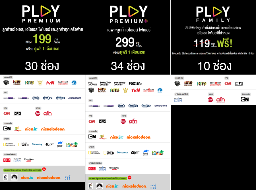 - Play Premium ในราคา 199 บาท มีช่องเพิ่มอีก 30 ช่อง