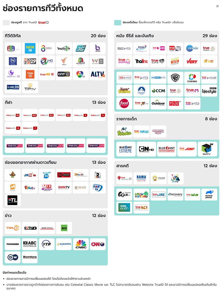 สำหรับช่องฟรีทีวีของทรูนั้น สามารถรับชมได้ทุกเครือข่ายเหมือนกับ AIS ค่ะ ปัจจุบันมี 51 ช่อง แต่ถ้าเป็นลูกค้าทรูอีกก็จะสามารถรับชมเพิ่มได้อีก (เฉพาะช่องที่รับชมผ่านอินเทอร์เน็ต ไม่รวมช่องแบบที่ติดตั้งจานดาวเทียมนะคะ)