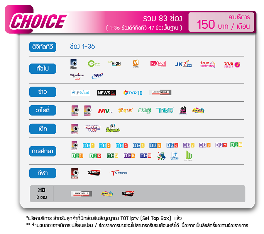 - แพ็กเกจ Choice จะมีทั้งหมด 83 ช่อง ค่าบริการเดือนละ 150 บาท