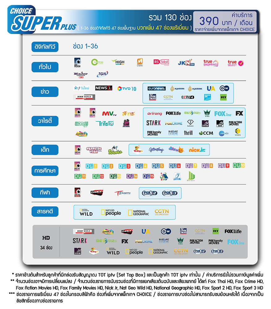 - แพ็กเกจ Super Choice Plus จะมีทั้งหมด 130 ช่อง ค่าบริการเดือนละ 390 บาท