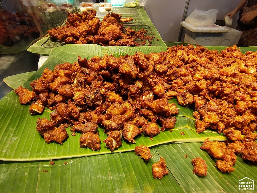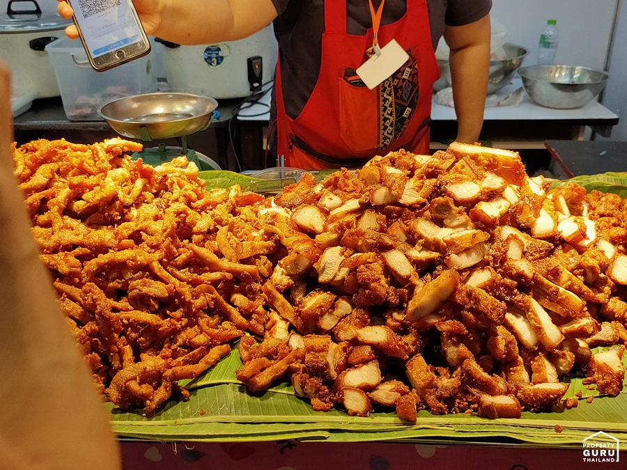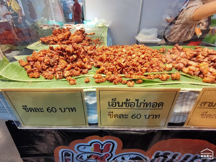 มีให้เลือกทานทั้งเนื้อหมูทอด หมูสามชั้นทอด กระดูกอ่อนทอด เอ็นข้อไก่ทอด ตับไก่ทอด ขีดละ 60 บาทเท่านั้น
