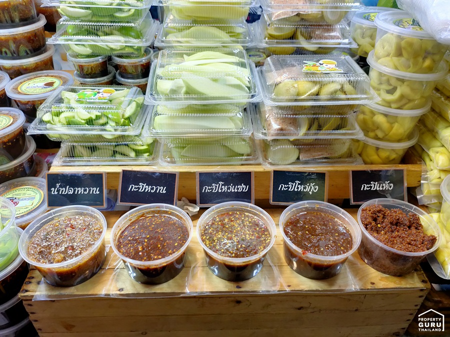 เชื่อว่าสายมะม่วงน้ำปลาหวานถ้าได้ลองชิมแล้วจะต้องหลงรักร้านนี้ เพราะน้ำจิ้มที่ทานคู่กับมะม่วงมีให้เลือกมากถึง 5 รสชาติ คือ น้ำปลาหวาน กะปิหวาน กะปิโหว่กุ้ง กะปิโหว่แซ่บ และกะปิแห้ง