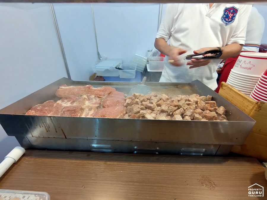 เนื้อหมูชิ้นใหญ่หั่นเป็นทรงลูกเต๋าย่างจนได้ที่เนื้อจะฉ่ำๆ ไม่แห้งจนเกินไป
