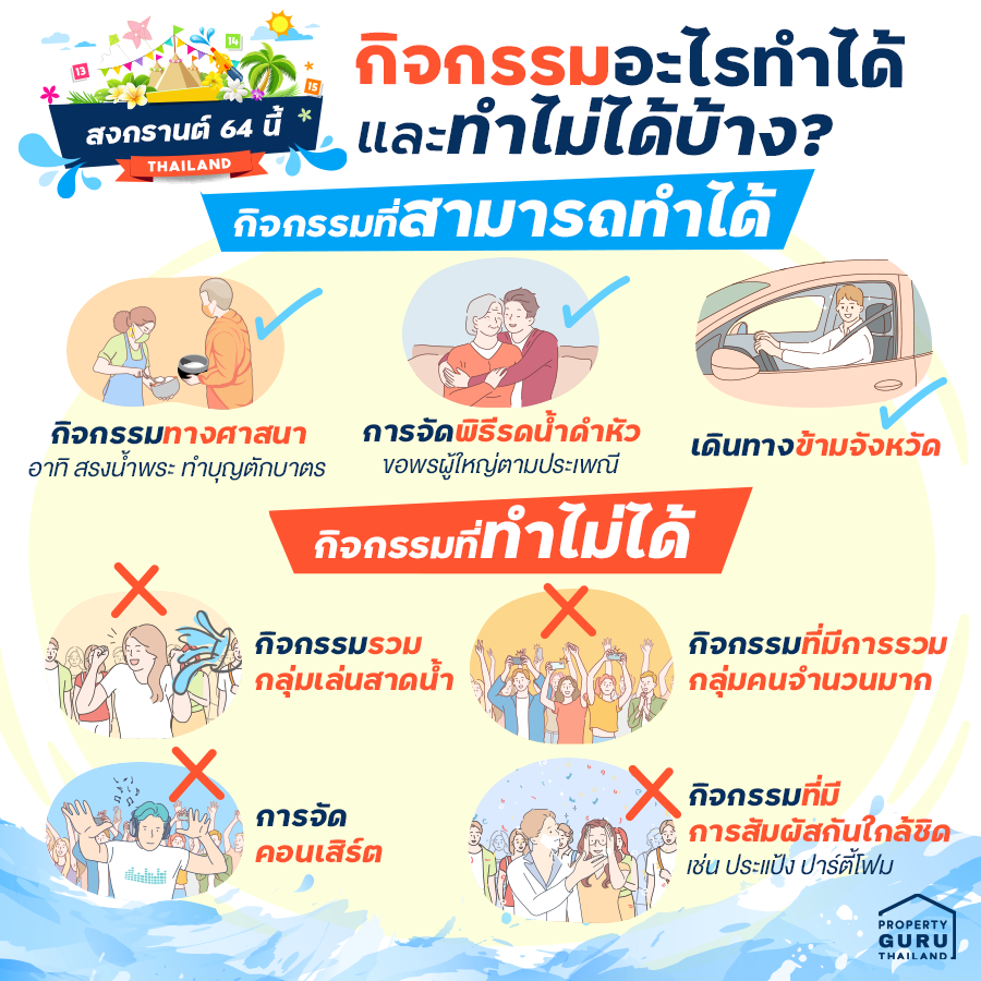 เมื่อวันที่ 19 มีนาคม 2564 นพ.ทวีศิลป์ วิษณุโยธิน โฆษกศูนย์บริหารสถานการณ์การแพร่ระบาดของโรคติดเชื้อไวรัสโคโรนา 2019 (โฆษก ศบค.) กล่าวในระหว่างแถลงสถานการณ์ประจำวันเกี่ยวกับการจัดกิจกรรมวันสงกรานต์ว่าที่ประชุม ศบค.ชุดใหญ่ มีมติ "ไม่อนุญาตให้เล่นสาดน้ำในช่วงเทศกาลสงกรานต์" แต่อนุญาตให้มีกิจกรรมบางอย่างได้ ดังนี้