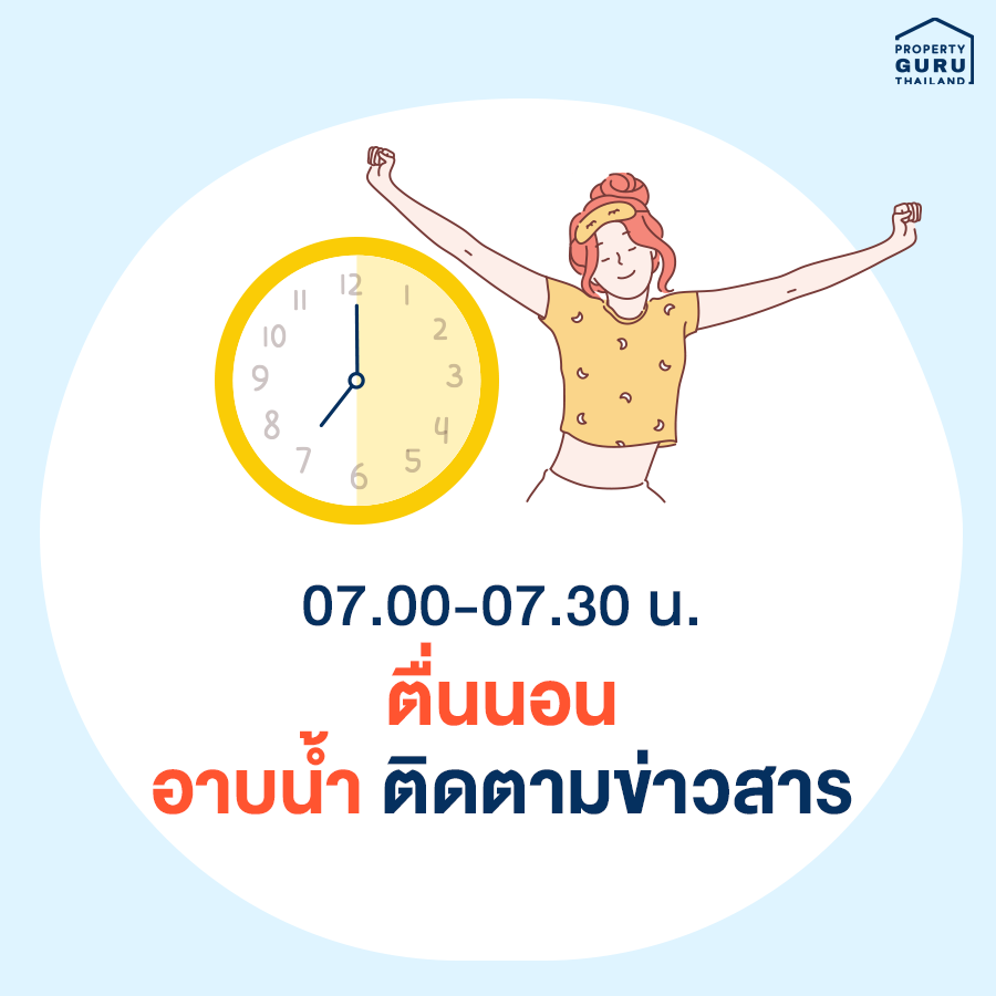 07.00-07.30 น. ตื่นนอน อาบน้ำ ติดตามข่าวสาร