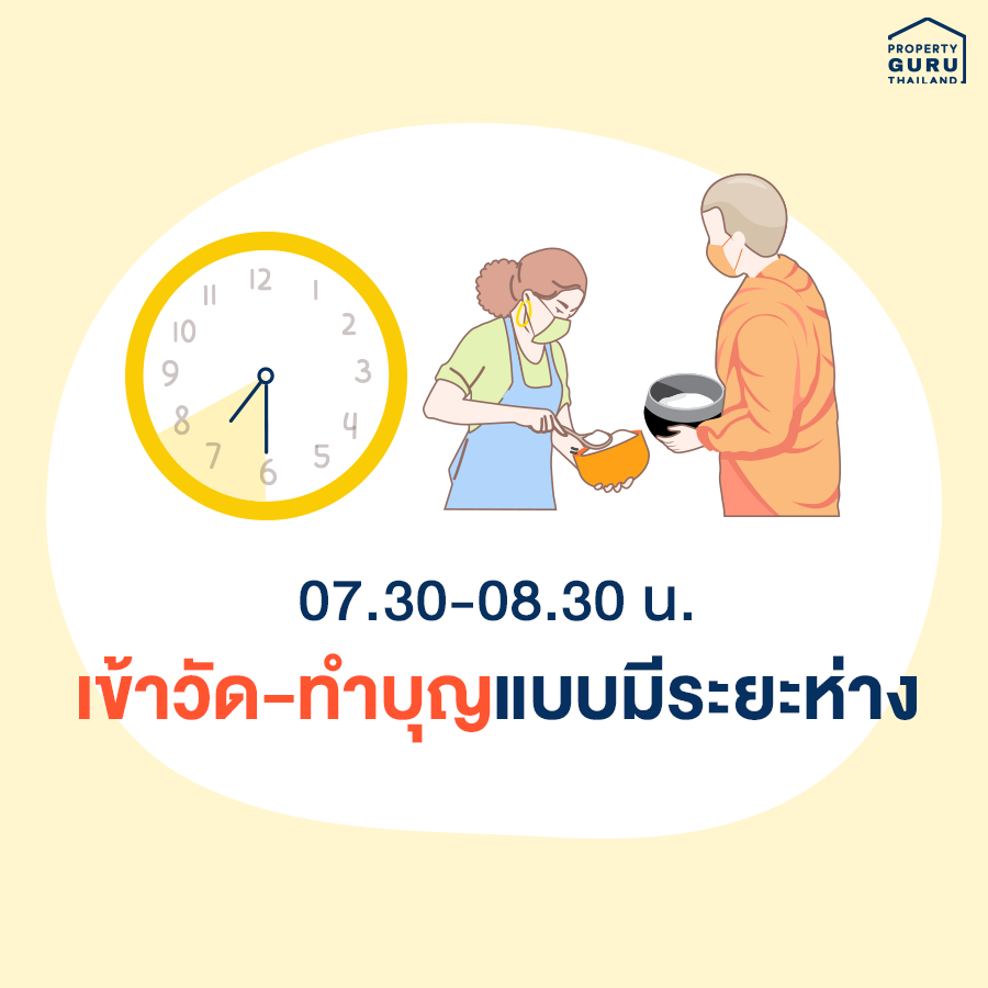 07.30-08.30 น. เข้าวัด-ทำบุญแบบมีระยะห่าง