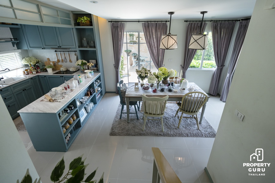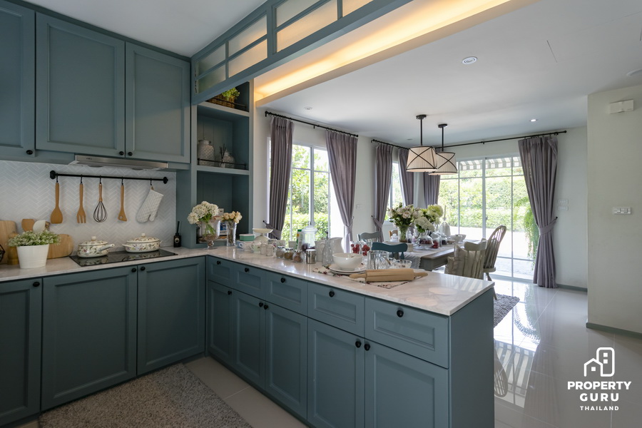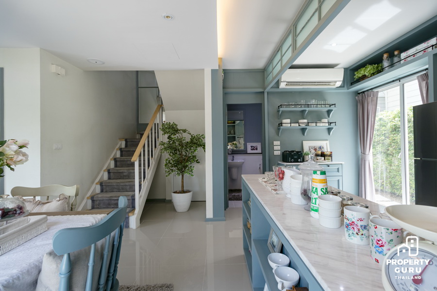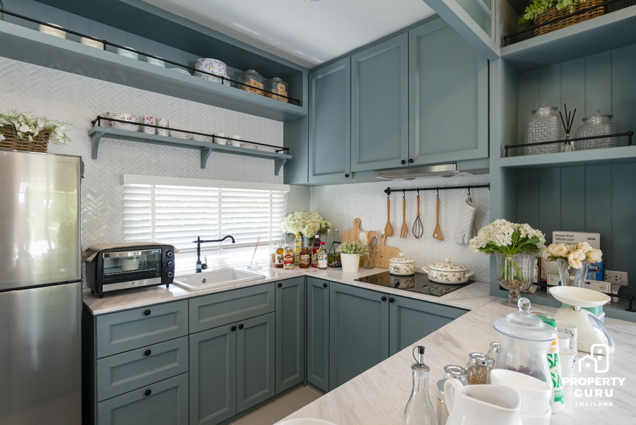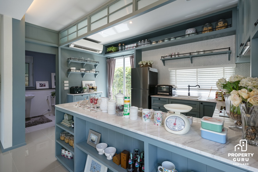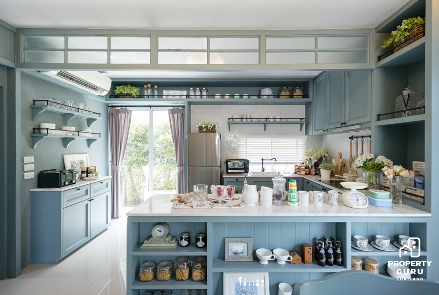 ด้านหลังเป็นพื้นที่ห้องครัว แต่งด้วยโทนสีพาสเทล ให้ความรู้สึกอบอุ่น