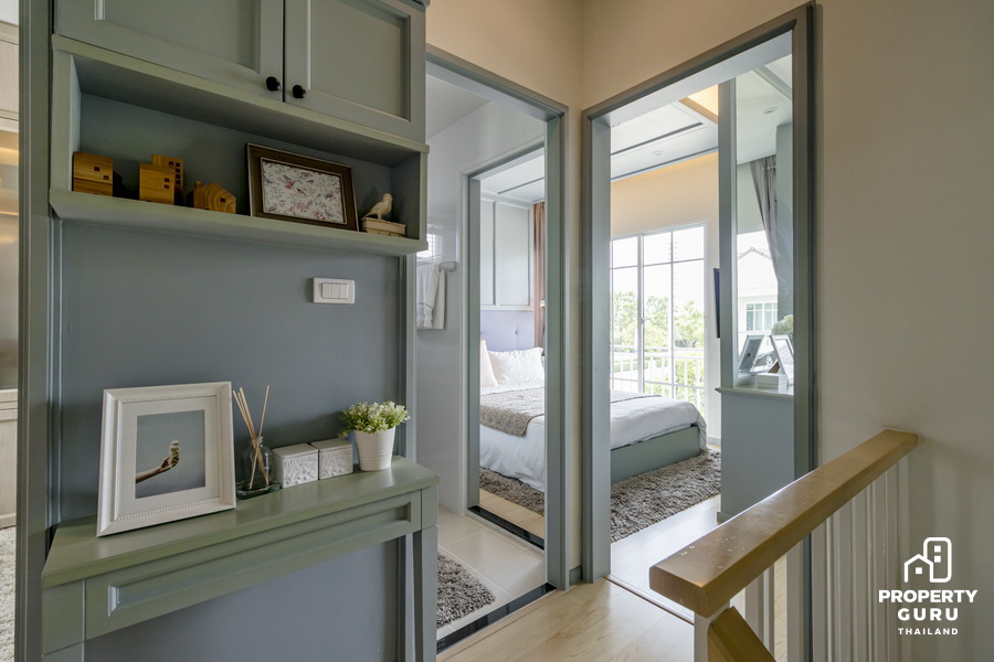 ขึ้นมาชั้น 2 ตรงโถงทางเดินยังพอมีพื้นที่ให้ตกแต่งทำชั้นลอยวางของเล็กๆ น้อยๆ ได้แบบนี้ เราจะเข้าไปทางฝั่งขวากันก่อนค่ะ ฝั่งนี้จะเป็นห้องน้ำ และ Master Bedroom