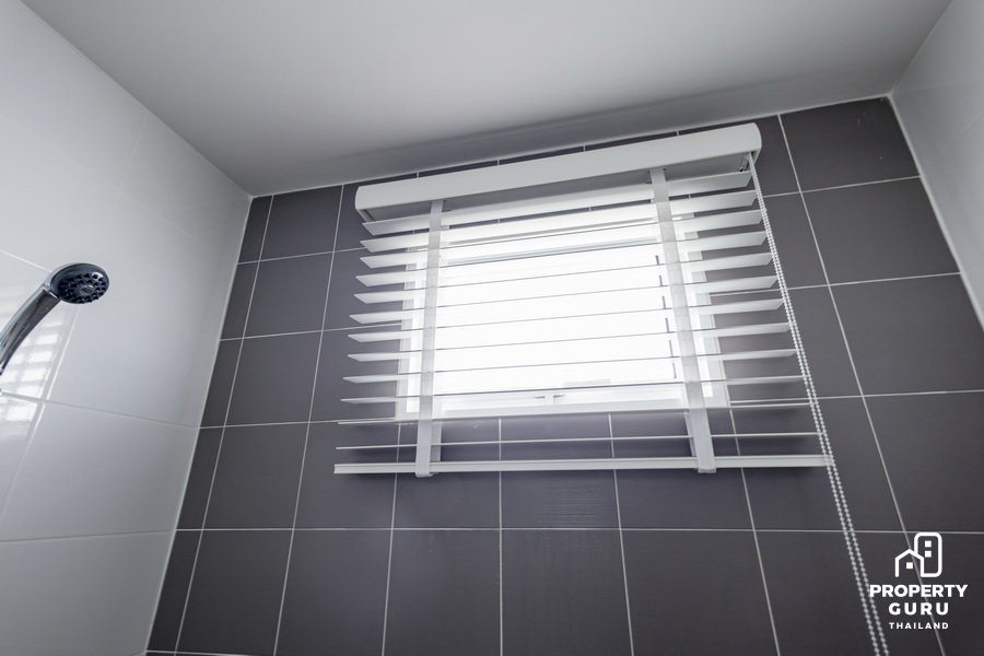 เขามีช่องหน้าต่างเล็กๆ สำหรับระบายอากาศให้ด้วยค่ะ โครงการแต่งด้วยม่านแบบมู่ลี่สีขาวกรองแสงได้
