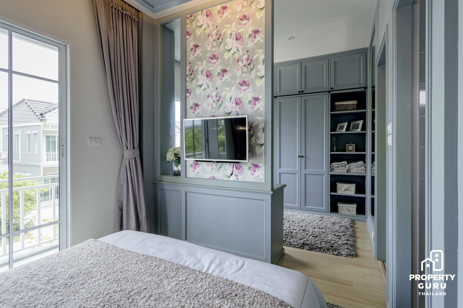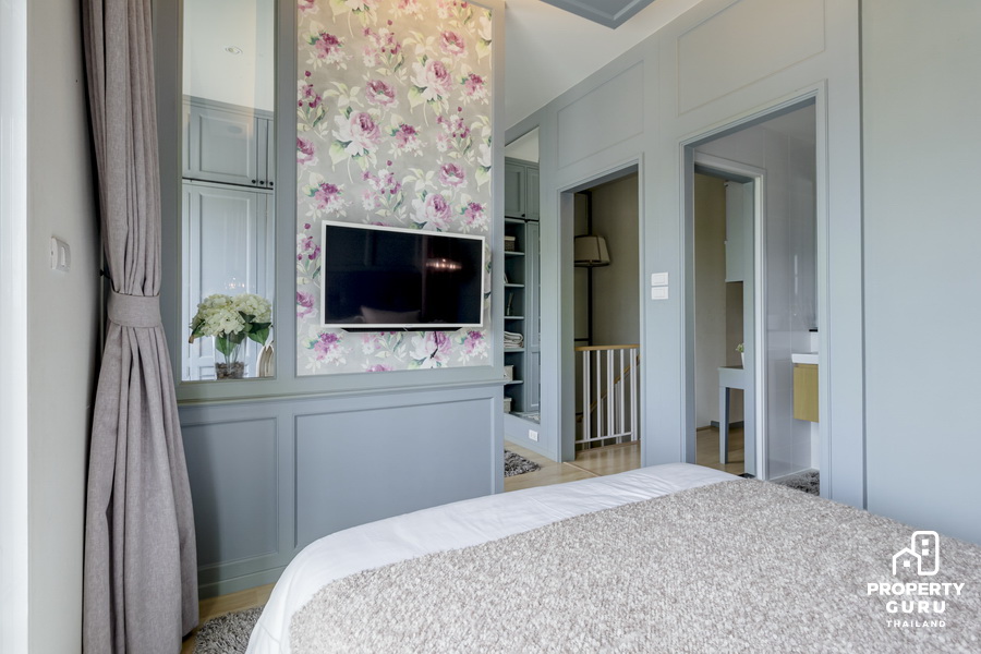 ปลายเตียงจะเป็นพื้นที่สำหรับ Walk-in Closet ซึ่งยังมีพื้นที่เพียงพอให้วางทีวีแบบแขวนผนังได้ด้วย