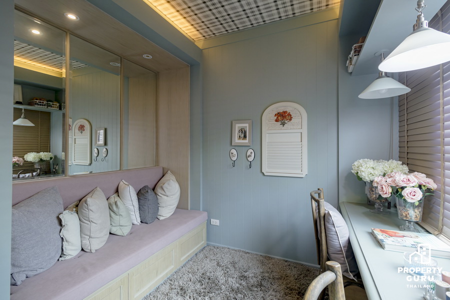 มุมส่วนตัวเอาไว้นั่งเล่น นอนงีบ หรือทำงานเบาๆ ชิลๆ ก็ได้ กระจกที่เห็นตรงนั้น ด้านนอกมีพื้นที่ให้วางกระถางเล็กๆ ได้ด้วยนะ
