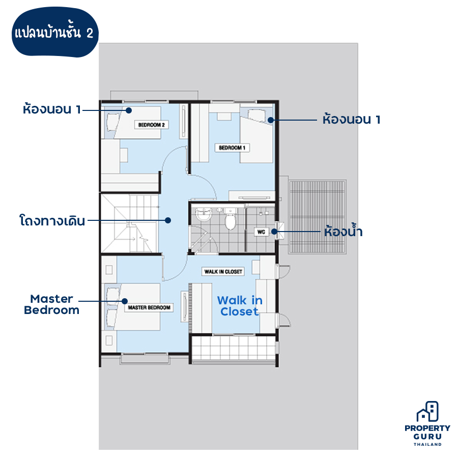 สำหรับแปลนบ้านชั้น 2 จะมีลักษณะตามภาพนี้เลยค่ะ มีห้องนอนอีก 3 ห้อง Master Bedroom ห้องนอนเล็กอีก 2 ห้อง และมีห้องน้ำอีก 1 ห้อง สำหรับห้องน้ำสามารถเข้า-ออกได้ 2 ทางคือจาก Master Bedroom และโถงทางเดิน