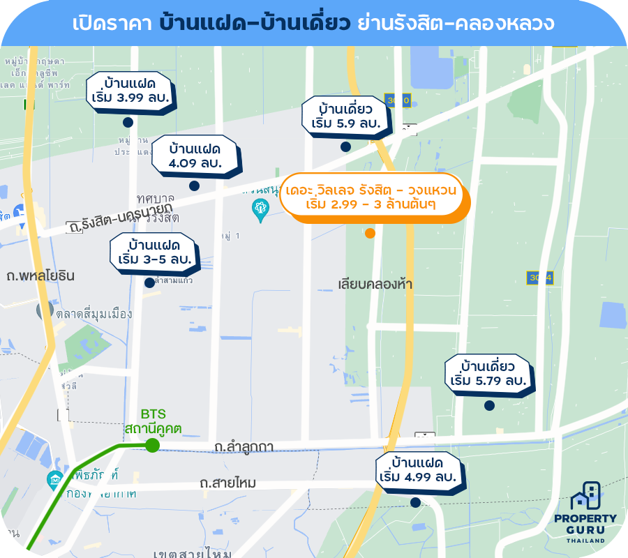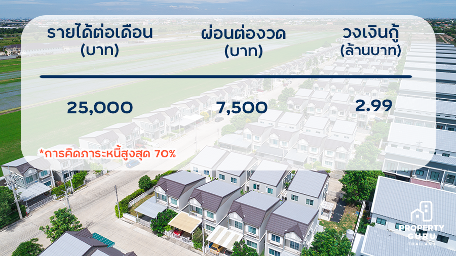 จากแผนที่ราคาบ้านย่านรังสิต - วงแหวนข้างต้นจะเห็นว่า ราคาเริ่มต้นของบ้านเดี่ยวจะอยู่ที่ประมาณ 5 ล้านปลายๆ เกือบ 6 ล้าน ทำให้รายได้ขั้นต่ำของผู้กู้ และผู้กู้ร่วมรวมกันต้องสูงถึง 100,000 บาทต่อเดือน ซึ่งอาจจะเป็นราคาที่ค่อนข้างสูง แต่สำหรับ เดอะ วิลเลจ รังสิต - วงแหวน เป็นบ้านหลังแรกที่ตอบโจทย์ ในราคาเริ่มต้น 2.99 - 3 ล้านต้นๆ ซึ่งรายได้ผู้กู้ และผู้กู้ร่วมรวมกันประมาณ 25,000 บาทก็สามารถกู้ได้แล้วค่ะ ยิ่งถ้าเป็น First Jobber ที่อายุยังน้อย จะยิ่งมีความได้เปรียบในเรื่องของระยะเวลาการกู้ที่จะได้นานขึ้นถึง 30 ปี สามารถเลือกการผ่อนต่อเดือนได้ต่ำลง ก็จะช่วยประหยัดค่าใช้จ่ายภาระผ่อนต่อเดือนได้อีกด้วยค่ะ