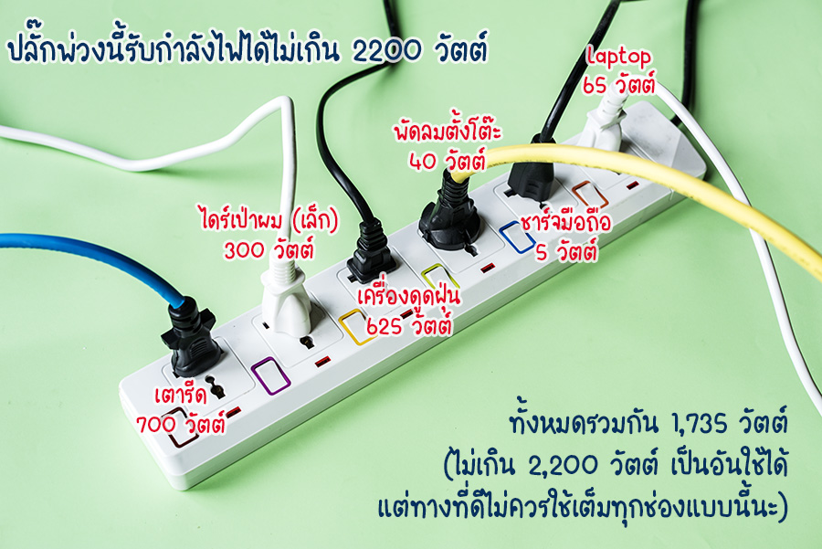 เราต้องเลือกไปใช้งานให้ถูกต้องตามกำลังไฟที่ระบุไว้ด้วยค่ะ เพราะถ้าหากใช้งานเกินกำลังไฟฟ้าที่ปลั๊กพ่วงรับได้ จะทำให้ปลั๊กไฟทำงานหนักเกินไป อาจจะเกิดอันตรายได้ค่ะ สำหรับปลั๊กพ่วงที่มีช่องรับเยอะๆ นั่นไม่ได้หมายความว่าจะสามารถรับกำลังไฟฟ้าได้เยอะตามนะคะ สมมติว่าปลั๊กพ่วงมีกำลังไฟ 2,200 วัตต์ ก็จะสามารถรับกำลังไฟของเครื่องใช้ไฟฟ้าทั้งหมดรวมกันได้ไม่เกิน 2,200 วัตต์เช่นกัน