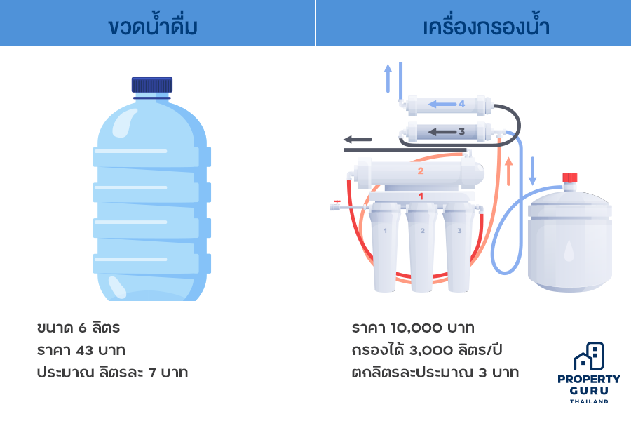 ส่วนเครื่องกรองน้ำระบบ RO โดยทั่วไป ราคาจะตั้งแต่ 5,000 - 15,000 บาท ในที่นี้เราคำนวณจากเครื่องกรองน้ำราคาเฉลี่ย 10,000 บาท ปีนึงเราใช้ทั้งน้ำดื่มกิน และประกอบอาหารภายในครอบครัว ปีละ 4,000 ลิตร ทำให้ค่าน้ำดื่มตกลิตรละ 2.5 บาทเท่านั้น