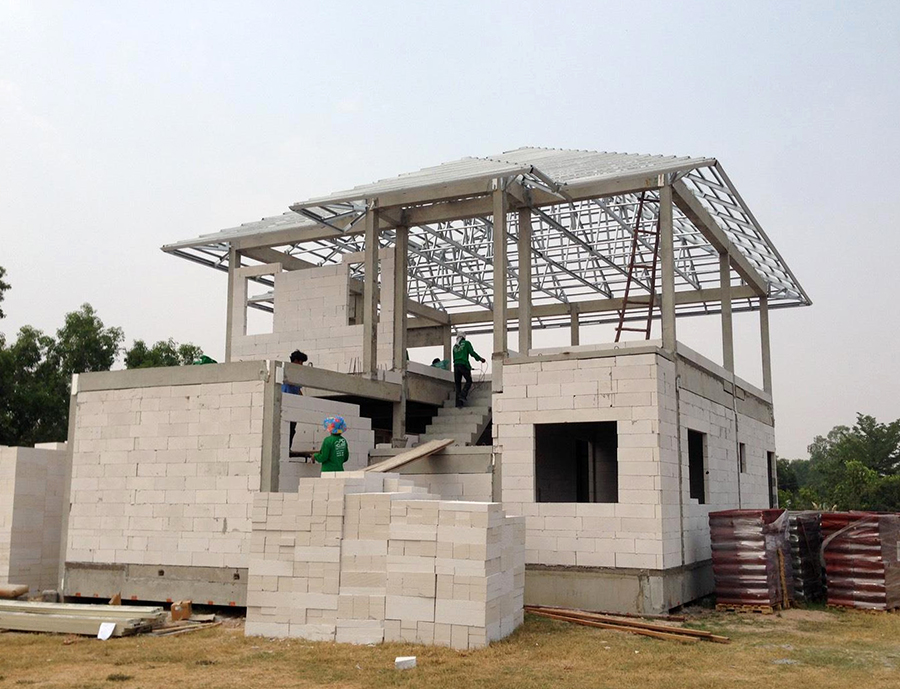 ขอบคุณภาพจาก www.pd.co.th อิฐมวลเบา (Foamed Concrete Block) มีส่วนผสมมากจากปูนซีเมนต์ ทราย ปูนขาว ผงอลูมิเนียม ยิปซั่ม และน้ำ ข้างในอิฐจะมีฟองอากาศเล็กๆ จึงทำให้มีน้ำหนักเบาและป้องกันความร้อนได้ โครงสร้างบ้านที่ก่อด้วยอิฐมวลเบาก็จะเป็นคอนกรีตเสริมเหล็กเช่นเดี่ยวกับอิฐมอญ แต่ด้วยขนาดที่ใหญ่กว่าอิฐมอญจึงทำให้ก่อสร้างได้รวดเร็วกว่า และก้อนอิฐได้มาตรฐานกว่า เพราะต้องทำจากโรงงานเท่านั้น เหมาะสำหรับนำไปก่อผนังหลักของบ้าน แต่ต้องระวังเรื่องการแตกลายงา (เทคนิคป้องกันการแตกลายงาก็คือไม่ควรฉาบปูนหนาเกินไป) และต้องระวังเรื่องการดูดซับน้ำทำให้ผนังขึ้นราหรือตะไคร่ขึ้นได้ง่าย ดังนั้นจึงไม่ควรนำมานำเป็นผนังส่วนห้องน้ำหรือห้องครัวค่ะ