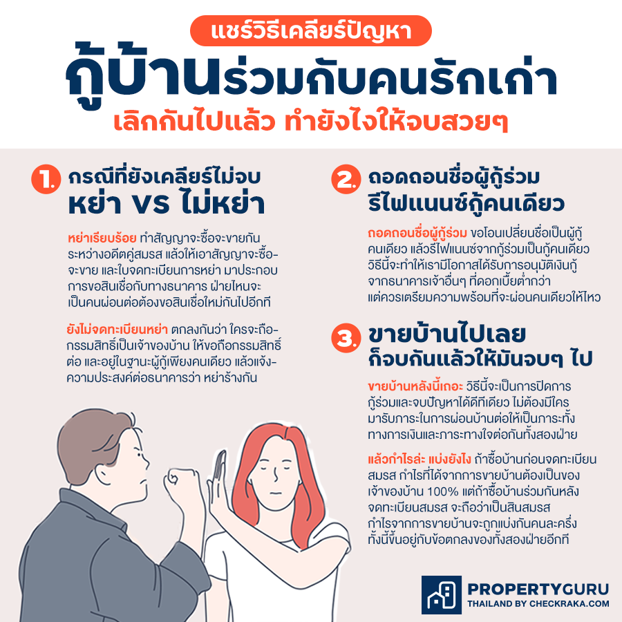 การเลิกกันอาจมีสถานะที่ยังคลุมเครือกันอยู่หน่อยๆ แผลยังไม่ได้หายสนิท มีทั้งที่เคลียร์กันลงตัวและยังยุ่งเหยิง โดยเฉพาะการจดทะเบียนอย่าอย่างเป็นทางการ ซึ่งตรงนี้มีความสำคัญต่อการเคลียร์เรื่องบ้านอยู่ไม่น้อย ทาง Krungsri Guru ก็บอกเอาไว้ว่า กรณีที่ทั้งคู่เคลียร์กันลงตัวจดทะเบียนหย่าเรียบร้อยแล้ว ถ้าฝ่ายใดฝ่ายหนึ่งไม่อยากผ่อนชำระหนี้แล้ว ยกบ้านให้กับอีกฝ่ายไปเลย กรณีนี้สามารถทำสัญญาจะซื้อจะขายกันระหว่างอดีตคู่สมรส แล้วให้เอาสัญญาจะซื้อจะขาย และใบจดทะเบียนการหย่า มาประกอบการขอสินเชื่อกับทางธนาคาร ฝ่ายไหนจะเป็นคนผ่อนต่อต้องขอสินเชื่อใหม่กันไปอีกที