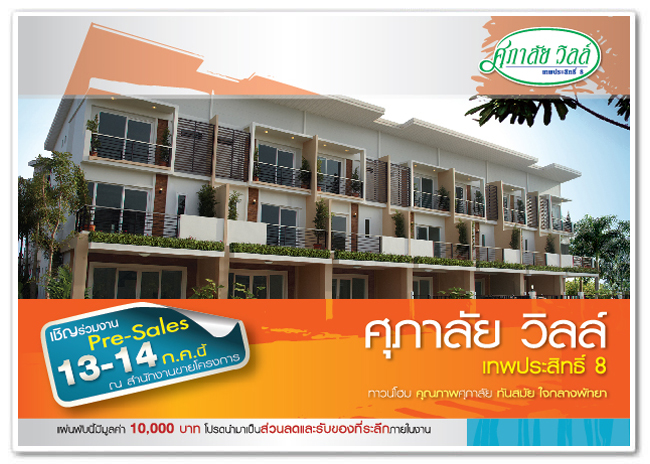 24 ก.ค. 56 3,139ศุภาลัย วิลล์ เทพประสิทธิ์ 8 พัทยา ทาวน์โฮม 3 ชั้น เปิด Presales พร้อมโปรโมชั่นพิเศษ 13 - 14 ก.ค. นี้บริษัท ศุภาลัย จำกัด (มหาชน) ได้เปิดตัวโครงการ ศุภาลัย วิลล์ เทพประสิทธิ์ 8 โครงการทาวน์โฮม 3 ชั้น สไตล์โมเดิร์น ตั้งอยู่บนถนนเทพประสิทธิ์ 8 เชื่อมต่อถนนเทพประสิทธิ์ และถนนพัทยาใต้ เดินทางง่าย และใกล้สิ่งอำนวยความสะดวกมากมาย ออกแบบให้เป็นบ้านประหยัดพลังงาน เน้นการออกแบบให้ทุกพื้นที่ใช้สอยประโยชน์ได้อย่างเต็มที่ และได้รับรองมาตรฐานระดับสากล ISO 9001:2008 ลักษณะโครงการเป็นทาวน์โฮม 3 ชั้น, 3 ห้องนอน, 3 ห้องน้ำ, ที่จอดรถ 2 คัน บนเนื้อที่โครงการกว่า 8 ไร่เดินทางเข้าออกโครงการได้สะดวกจากหลายเส้นทาง หากมาจากกรุงเทพฯทางถนนสุขุมวิทมุ่งหน้า สัตหีบ เลี้ยวขวาเข้าถ.เทพประสิทธิ์ (ทางไปหาดจอมเทียน) วิ่งตรงมาประมาณ 1.4 กม. เลี้ยวขวาเข้าถนนเทพประสิทธิ์ 8 วิ่งตรงไปประมาณ 500 ม. โครงการจะอยู่ซ้ายมือ นอกจากนั้นยังแวดล้อมด้วยสิ่งอำนวยความสะดวกต่าง ๆ เช่น Outlet Mall, โลตัส, บิ๊กซี, รพ.กรุงเทพฯ-พัทยา, รร.อักษรเทคโนโลยี, พัทยาปาร์ค, หาดจอมเทียน และเขาพระตำหนักโปรโมชั่น ราคาพิเศษเฉพาะช่วงเปิดโครงการ วันที่ 13 - 14 ก.ค. 56 นี้เท่านั้น