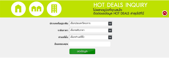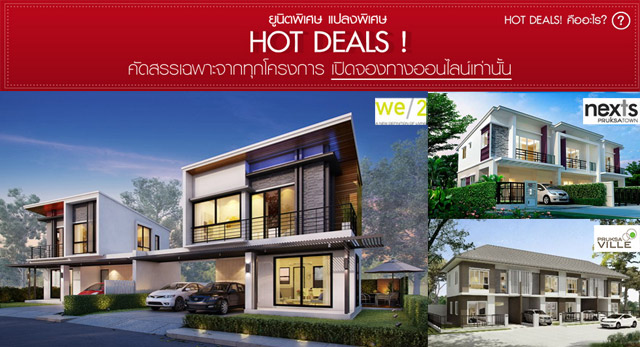 HOT DEALS! ยูนิตพิเศษ แปลงพิเศษ คัดสรรเฉพาะจากทุกโครงการ ทั้งส่วนลด ของแถม หรือฟรีเงินดาวน์ เฉพาะผู้จองผ่านทางออนไลน์ผ่านทางเว็บไซต์ของพฤกษาเท่านั้น!สำหรับท่านที่เป็นสมาชิกเว็บไซต์ของพฤกษา (สมัครสมาชิกคลิกที่นี่) สามารถใช้งานในส่วน Hot Deals ได้ด้วยขั้นตอนง่ายๆ ดังต่อไปนี้- คลิกที่เมนู Hot Deals ที่หน้า Hot Deals จะพบยูนิตที่ได้รับความนิยมสูงสุดจากแต่ละประเภทโครงการ ได้แก่ บ้านเดี่ยว, ทาวเฮ้าส์ และคอนโด