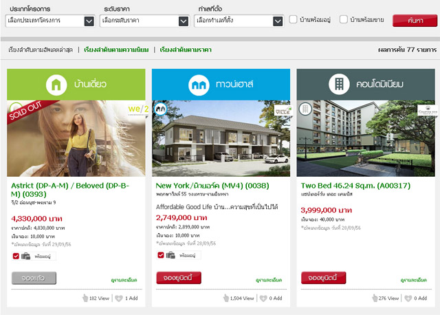 - เมื่อพบยูนิตที่สนใจ สามารถคลิกดูรายละเอียด โดยสามารถบันทึกเป็นรายการโปรดเพื่อรอการตัดสินใจ หรือคลิก "จองยูนิต" เพื่อเข้าสู่ระบบ Online Reservation ซึ่งบริการจองโครงการที่สนใจผ่านออนไลน์ได้ทันที ไม่ต้องเสียเวลาไปเดินเรื่องถึงโครงการ