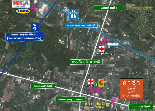 แผนที่โครงการคาซ่าวิลล์ บางนา - เทพารักษ์โครงการตั้งอยู่บนทำเลที่ดี บนถนนเทพารักษ์ เชื่อมต่อกับถนนหลักหลายเส้นเช่น ถนนกาญจนาภิเษก (วงแหวนรอบนอกฝั่งใต้), ทางด่วนบางนา - ชลบุรี, ถนนกิ่งแก้ว, ถนนตำหรุ - บางพลี รวมถึงสถานที่สำคัญ และห้างสรรพสินค้าต่างๆ เช่น โรงพยาบาลบางพลี, โรงพยาบาลจุฬารัตน์ 1, บิ๊กซี, เทสโก้โลตัส, Mega Bangna และ IKEAคาซ่าวิลล์ บางนา - เทพารักษ์ เปิดให้จองในช่วง ต.ค. 56 นี้ โดยสามารถลงทะเบียนเพื่อรับข่าวสารได้ตั้งแต่วันนี้เป็นต้นไปข่าว-โปรโมชั่นล่าสุดอื่นๆ