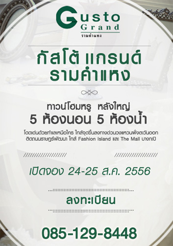 2. กัสโต้ แกรนด์ รามคำแหงทาวน์โฮมหรู หลังใหญ่ 5 ห้องนอน 5 ห้องน้ำ โดดเด่นด้วยทำเลเหนือใคร ใกล้จุดขึ้นลงทางด่วนวงแหวนฝั่งตะวันออก ติดถนนราษฎร์พัฒนา ใกล้ Fashion Island และ The Mall บางกะปิ เปิดจอง 24 - 25 ส.ค. 56 สามารถติดต่อโครงการได้ที่เบอร์ 085-129-8448พิเศษ!!! ลงทะเบียนผ่านเว็บไซต์ เมื่อซื้อ และโอนกรรมสิทธิ์ ได้รับ Gift Voucher จาก Homepro มูลค่า 5,000 บาท