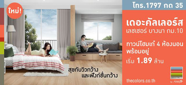 บริษัท อารียา พรอพเพอร์ตี้ จำกัด (มหาชน) ได้เปิดตัวโครงการทาวน์โฮมพร้อมอยู่ "เดอะคัลเลอร์ส เลชเชอร์ บางนา กม.10 (The Colors Leisure Bangna Km 10)" หลังจากที่ได้เปิดตัวทาวน์โฮม เดอะ คัลเลอร์ส พรีเมี่ยม บางนา กม.10 ในย่านบางนาใกล้ๆ กันไปก่อนหน้านี้ลักษณะโครงการเป็นทาวน์โฮมเก๋ 4 ห้องนอน ใกล้ Mega Bangna และ IKEA พร้อมคลับเฮ้าส์ เริ่มต้นที่ 1.89 ล้านบาทพิเศษ!!! ลงทะเบียนที่ลิงก์ข้างล่างเพื่อรับส่วนลด 10,000 บาท จากโครงการต่างๆ ของอารียา ตั้งแต่วันนี้ - 31 ส.ค. 56 (เงื่อนไขเป็นไปตามที่บริษัทกำหนด)หากท่านสนใจโครงการสามารถสอบถามรายละเอียดเพิ่มเติมได้ที่ โทร.1797 กด 35 หรือที่เว็บไซต์ http://www.thecolors.co.thข่าว-โปรโมชั่นล่าสุดอื่นๆ