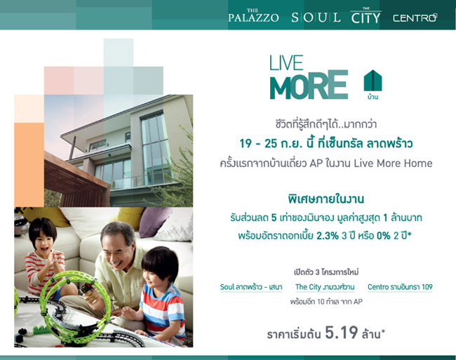 AP จัดงาน "Live More Home" งานใหญ่ครั้งแรกเพื่อเอาใจคนอยากมีบ้านเดี่ยว พร้อมเปิดตัว 3 โครงการบ้านเดี่ยวทำเลใหม่ "Soul ลาดพร้าว-เสนา", "The City งามวงศ์วาน" และ "Centro รามอินทรา 109" นอกจากนี้ยังรวบรวมเอาโครงการบ้านเดี่ยวคุณภาพ ทำเลโดนๆ ภายใต้การดูแลของ AP อีกกว่า 10 โครงการมารวมไว้ในงานเดียว เพื่อเอาใจแฟนๆ ของ AP โดยเฉพาะ งาน "Live More Home" ครั้งนี้จัดขึ้นที่ห้างสรรพสินค้าเซ็นทรัลลาดพร้าว บริเวณลานกิจกรรมชั้น G ตั้งแต่วันที่ 19 - 25 กันยายน 2556 งานนี้นอกจากจะคุ้มค่าได้ชมโครงการบ้านทุกทำเลจาก AP และรับโปรโมชั่นสุดพิเศษจากหลายๆ โครงการแล้ว ผู้เข้าร่วมงานที่ร่วมกิจกรรมกับทาง AP ยังจะได้รับของที่ระลึกเป็นหมอนเก๋ๆ และได้รับชมมินิคอนเสิร์ตจากศิลปินคุณภาพอย่าง ป๊อด ธนชัย อุชชิน (วันเสาร์ที่ 21 ก.ย. 56 เวลา 19.00 น.) และศิลปินสุดหล่อน้ำเสียงทรงเสน่ห์อย่าง ปีเตอร์ คอร์ป ไดเรนดัล (วันอาทิตย์ที่ 22ก.ย. 56 เวลา 19.00 น.) อีกด้วย