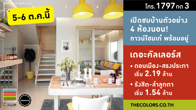 16 ต.ค. 56 5,3785-6 ต.ค.นี้ พบกันในงานเปิดชมบ้านตัวอย่าง 4 ห้องนอน ที่เดอะคัลเลอร์ส บน 2 ทำเลศักยภาพ