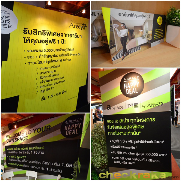 บรรยากาศการตกแต่งคอนโด aspaceโปรโมชั่นของอารียาฯ ในงานนี้งานนี้อารียาฯ จัดโปรโมชั่นสำหรับผู้ที่ซื้อบ้าน และคอนโดของอารียาเฉพาะในงานนี้ ด้วยคอนเซปต์ "อยู่ฟรี 1 ปี" โดยมีรายละเอียดตามภาพข้างล่างนี้