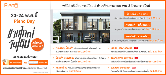 17 ม.ค. 57 670เอพี ไทยแลนด์ จัดโปรโมชั่น "Pleno Day แจกใหญ่ จัดเต็ม" ครั้งเดียวในรอบปีบริษัท เอพี (ไทยแลนด์) จำกัด (มหาชน) จัดโปรโมชั่นสำหรับผู้ที่กำลังสนใจซื้อทาวน์โฮม สไตล์หรูหราแบบยุโรป หรืออบอุ่นแบบเอเชีย ทำเลคุณภาพแบรนด์ Pleno (พลีโน่) จาก AP ในวันที่ 23 - 24 พฤศจิกายน 2556 งานนี้ลูกค้าสามารถเลือกรับโปรโมชั่นพิเศษ ฟรี! ค่าใช้จ่ายวันโอน หรือ ฟรี! แอร์ทั้งหลัง พร้อมรับของขวัญสุดเซอร์ไพรส์ภายในวันงาน (จำนวนจำกัด)