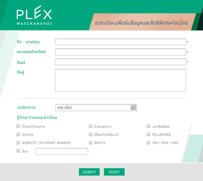 บริษัท เรียลแอสเสท ดีเวลลอปเมนท์ จำกัด ส่งโปรโมชั่นหวานๆ สำหรับผู้สนใจเป็นเจ้าของโครงการทาวน์โฮมในเดือนแห่งความรัก เริ่มต้นกับงานเปิดบ้านตัวอย่าง 8-9 กุมภาพันธ์ 2557 นี้ที่โครงการ Plex (วัชรพล) ด้วยโปรโมชั่นราคาพิเศษเริ่มต้น 4 ล้านบาท พร้อมรับ Valentine's Love Gift Special สำหรับลูกค้าที่แวะเยี่ยมชมโครงการ Plex (วัชรพล) และ Plex (บางนา) ตลอดทั้งเดือนกุมภาพันธ์ท่านที่สนใจสามารถลงทะเบียนเพื่อรับข่าวสาร และสิทธิพิเศษได้ที่ลิงก์ข้างล่างนี้สนใจสอบถามรายละเอียด โทร. 02-652-8852-55 หรือ www.realasset.co.thดูรายละเอียดโครงการ เพล็กซ์ วัชรพล (Plex Watcharapol)ข่าว-โปรโมชั่นล่าสุดอื่นๆ