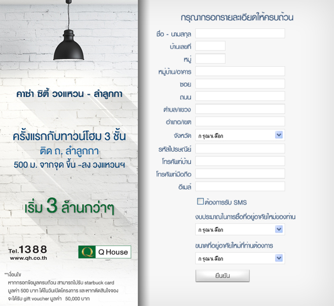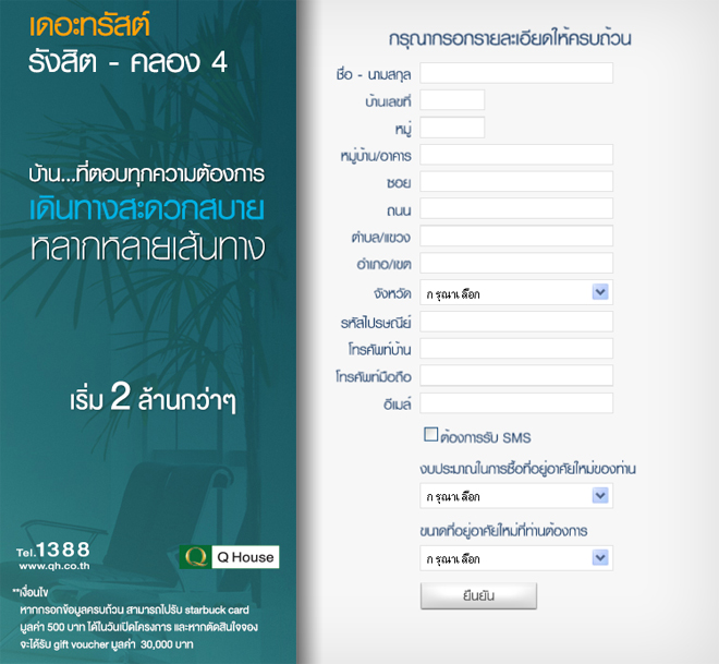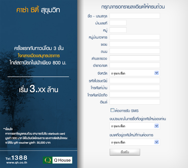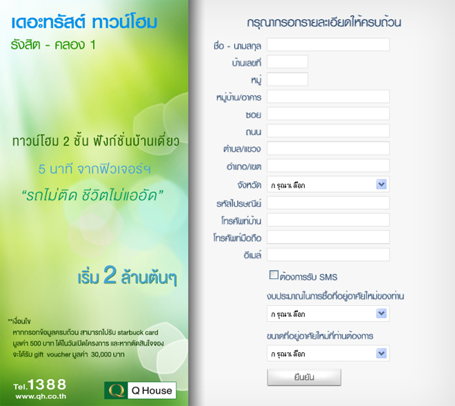 บริษัท ควอลิตี้เฮ้าส์ จำกัด (มหาชน) และบริษัทในเครือ เปิดให้จอง 4 โครงการใหม่ คาซ่า ซิตี้ วงแหวน - ลำลูกกา (Casa City Wongwaen - Lumlukka), คาซ่า ซิตี้ สุขุมวิท (Casa City Sukhumvit), เดอะทรัสต์ ทาวน์โฮม รังสิต คลอง 1 (The Trust Townhome Rangsit - Klong 1) และ เดอะทรัสต์ รังสิต - คลอง 4 (The Trust Rangsit - Klong 4) โดยสามารถลงทะเบียนผ่านเว็บไซต์เพื่อรับข่าวสารและสิทธิพิเศษได้ตั้งแต่วันนี้เป็นต้นไป1. คาซ่า ซิตี้ วงแหวน - ลำลูกกา (Casa City Wongwaen - Lumlukka)ครั้งแรกกับทาวน์โฮม 3 ชั้น ติดถนนลำลูกกา 500 เมตรจากจุดขึ้นลง วงแหวนฯ ราคาเริ่มที่ 3 ล้านกว่าบาทพิเศษ!!! ลงทะเบียนผ่านเว็บไซต์ หากกรอกข้อมูลครบถ้วน สามารถไปรับ Star Buck Card มูลค่า 500 บาท ได้ในวันเปิดโครงการ และหากตัดสินใจจอง จะได้รับ Gift Voucher มูลค่า 50,000 บาท2. คาซ่า ซิตี้ สุขุมวิท (Casa City Sukhumvit)ครั้งแรกกับทาวน์โฮม 3 ชั้น ใจกลางเมืองสมุทรปราการ ใกล้สถานีรถไฟฟ้า (BTS แพรกษา) เพียง 800 เมตร ราคาเริ่ม 3.xx ล้านพิเศษ!!! ลงทะเบียนผ่านเว็บไซต์ หากกรอกข้อมูลครบถ้วน สามารถไปรับ Star Buck Card มูลค่า 500 บาท ได้ในวันเปิดโครงการ และหากตัดสินใจจอง จะได้รับ Gift Voucher มูลค่า 30,000 บาท3. เดอะทรัสต์ ทาวน์โฮม รังสิต คลอง 1 (The Trust Townhome Rangsit - Klong 1)ทาวน์โฮม 2 ชั้น ฟังก์ชั่นบ้านเดี่ยว เพียง 5 นาทีจาก ฟิวเจอร์ พาร์ค รังสิต กับสโลแกน "รถไม่ติด ชีวิตไม่แออัด"พิเศษ!!! ลงทะเบียนผ่านเว็บไซต์ หากกรอกข้อมูลครบถ้วน สามารถไปรับ Star Buck Card มูลค่า 500 บาท ได้ในวันเปิดโครงการ และหากตัดสินใจจอง จะได้รับ Gift Voucher มูลค่า 30,000 บาท4. เดอะทรัสต์ รังสิต - คลอง 4 (The Trust Rangsit - Klong 4)บ้านที่ตอบทุกความต้องการ เดินทางสะดวกสบาย หลากหลายเส้นทาง เริ่มที่ 2 ล้านกว่าๆพิเศษ!!! ลงทะเบียนผ่านเว็บไซต์ หากกรอกข้อมูลครบถ้วน สามารถไปรับ Star Buck Card มูลค่า 500 บาท ได้ในวันเปิดโครงการ และหากตัดสินใจจอง จะได้รับ Gift Voucher มูลค่า 30,000 บาทสอบถามรายละเอียดเพิ่มเติมได้ที่ โทร. 1388 หรือทางเว็บไซต์ Q House www.qh.co.th และ เว็บไซต์ The Trust www.theconfidence.co.th