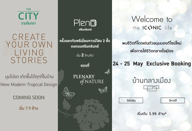 ภาพจำลองแบบบ้านโครงการ เดอะ ซิตี้ รามอินทราท่านที่สนใจสามารถลงทะเบียนเพื่อรับข่าวสาร และส่วนลดพิเศษ 50,000 บาท ได้ที่ลิงก์ข้างล่างนี้2. พลีโน่ ศรีนครินทร์ (Pleno Srinakarin)โครงการ พลีโน่ ศรีนครินทร์ เป็นโครงการล่าสุดจากแบรนด์ Pleno โครงการทาวน์โฮม 2 ชั้น ให้คุณได้พบกับพรีเมียมทาวน์โฮม ครั้งแรกบนถนนศรีนครินทร์ราคาเริ่มต้นที่ 2 ล้านต้นๆท่านที่สนใจสามารถลงทะเบียนเพื่อรับข่าวสาร และสิทธิพิเศษได้ที่ลิงก์ข้างล่างนี้3. บ้านกลางเมือง รัชโยธิน - วิภาวดี (Baan Klang Muang Ratchayothin - Vibhavadee)โครงการบ้านกลางเมือง รัชโยธิน - วิภาวดี เป็นทาวน์โฮม 3 ชั้น ใจกลางเมือง เป็นโครงการใหม่ล่าสุดที่เปิดให้จอง ในวันที่ 24-25 พฤษภาคม 2557 นี้ราคาเริ่มต้นที่ 5.99 ล้าน*ท่านที่สนใจสามารถลงทะเบียนเพื่อรับข่าวสาร และส่วนลดเงินสดมูลค่า 20,000 บาท*ได้ที่ลิงก์ข้างล่างนี้*เงื่อนไขราคาและรายการส่งเสริมการขายอยู่ภายใต้บริษัท และสถาบันการเงินกำหนดสนใจสอบถามรายละเอียดเพิ่มเติมได้ที่ โทร. 1623 หรือทางเว็บไซต์ www.apthai.comข่าว-โปรโมชั่นล่าสุดอื่นๆ