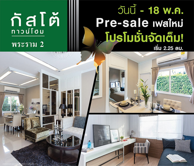 กัสโต้ วิลเลจ ได้จัดงาน Pre-sale เฟสใหม่กับโครงการ "กัสโต้ พระราม 2 (Gusto Rama 2)" ตั้งแต่วันนี้ - 18 พฤษภาคม 2557 ในราคาเพียง 2.25 ล้านบาท อย่าพลาดกับโปรโมชั่นจัดเต็มสุดๆ ที่สำนักงานขายของโครงการกัสโต้ พระราม 2 (Gusto Rama 2) เป็นทาวน์โฮมเทรนด์ใหม่ สไตล์โดดเด่น รองรับการใช้ชีวิตของคนเมือง กว้างขวางโอ่อ่า ลงตัวทุกการใช้สอย เชื่อมต่อชีวิตให้ใกล้ธรรมชาติมากขึ้น พร้อมสวนสาธารณะภายในโครงการ