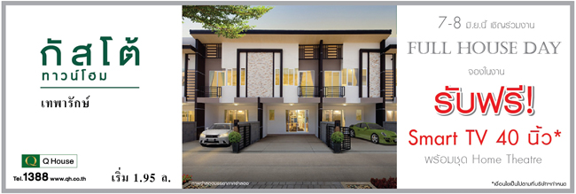 กัสโต้ วิลเลจ ขอเชิญลูกค้าที่สนใจ ร่วมงาน "Full House Day" กับโครงการ "กัสโต้ เทพารักษ์ (Gusto Teparak)" ทาวน์โฮม 2 ชั้น สไตล์โมเดิร์น ใกล้เมกา บางนา และใกล้ทางด่วนกาญจนาภิเษก งานจะมีขึ้นในวันที่ 7-8 มิถุนายน นี้ โปรโมชั่นพิเศษ อยู่ฟรี 1 ปี จองในงาน รับฟรี Smart TV 40 นิ้ว* พร้อมชุด Home Theatre เริ่ม 1.95 ล้านบาท*