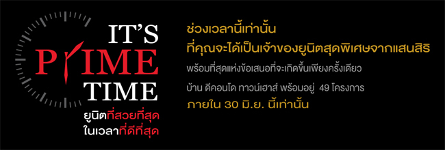 แสนสิริ ส่งที่สุดของโปรโมชั่นสำหรับลูกค้า ในแคมเปญ "IT'S PRIME TIME" ให้คุณได้เป็นเจ้าของยูนิตที่สวยที่สุด ในเวลาที่ดีที่สุด จากแสนสิริ พร้อมที่สุดแห่งข้อเสนอ ที่จะเกิดขึ้นเพียงครั้งเดียว กับบ้าน ทาวน์เฮ้าส์ ดีคอนโด พร้อมอยู่ 49 โครงการ ตั้งแต่วันนี้ - 30 มิถุนายน 2557 นี้เท่านั้นTime for Best Price ครั้งเดียวกับราคาพิเศษที่สุด