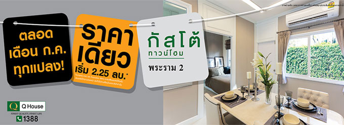 บริษัท กัสโต้ วิลเลจ จำกัด บริษัทในเครือของ บริษัท ควอลิตี้เฮ้าส์ จำกัด (มหาชน) จัดโปรโมชั่น ราคาเดียว 2.25 ล้านบาท ทุกแปลง! ที่ กัสโต้ พระราม 2 (กัสโต้ พระราม 2) ทาวน์โฮมเทรนด์ใหม่ มีสไตล์โดดเด่นด้วยการออกแบบฟังก์ชันบ้านที่คำนึงถึงทิศทางแสง ลม และการหมุนเวียนถ่ายเทอากาศ กว้างขวาง โอ่อ่า ด้วยฝ้าเพดานสูงเกือบ 3 เมตร ลงตัวทุกการใช้สอย เชื่อมต่อชีวิตให้ใกล้ชิดธรรมชาติมากขึ้น โครงการเริ่มสร้างตั้งแต่เดือนพฤศจิกายน ปี 2555 คาดว่าจะแล้วเสร็จปี 2557 จำนวนบ้านที่เปิดขายทั้งหมด 303 ยูนิตโครงการเป็นทาวน์เฮ้าส์-ทาวน์โฮม 2 ชั้น มี 2 แบบ ดังนี้