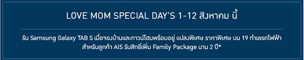 บริษัท พร็อพเพอร์ตี้ เพอร์เฟค จำกัด (มหาชน) จัดโปรโมชั่นพิเศษต้อนรับวันแม่ LOVE MOM SPECIAL DAY 'S สำหรับลูกค้าที่จองบ้านและทาวน์โฮมพร้อมอยู่ บน 19 ทำเลรถไฟฟ้า แปลงพิเศษในราคาพิเศษ พร้อมรับ Samsung Galaxy Tab S และรับสิทธิ์เพิ่มสำหรับลูกค้า AIS รับฟรี Family Package นาน 2 ปี* (โทรหากันฟรีในครอบครัวนาน 2 ปี และรับฟรี Internet 3G 5GB ต่อเดือนนาน 2 ปี)