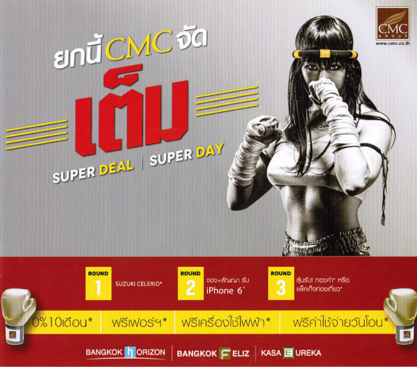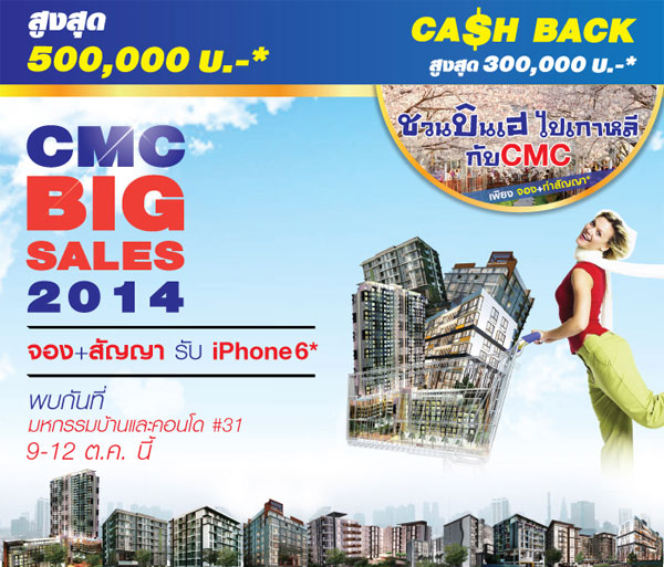 งานนี้ CMC ยกขบวนโปรโมชั่นมาเอาใจลูกค้าด้วยกัน 2 โปรฯ คือ "CMC ยกนี้จัดเต็ม SUPER DEAL | SUPER DAY" และโปรฯ CMC BlG SALES 2014 ชวนบินเฮ ไปเกาหลี พร้อมมอบโบนัส 3 ชั้น 1. SUZUKI CELERIO 2. จอง+สัญญารับ iPhone6* 3. ลุ้นรับ ! ทองคำ* หรือแพคเกจท่องเที่ยว*
