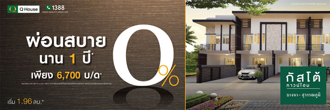 บริษัท กัสโต้ วิลเลจ จำกัด บริษัทในเครือ บริษัท ควอลิตี้เฮ้าส์ จำกัด (มหาชน) จัดโปรโมชั่นพิเศษกับโครงการ "กัสโต้ บางนา-สุวรรณภูมิ (Gusto Bangna-Suwannabhumi)" ผ่อนสบาย 0 % นานถึง 1 ปี ผ่อนเพียง 6,700 บาท/เดือน ราคาเริ่มที่ 1.96 ล้านบาทแบบบ้านภายในโครงการ