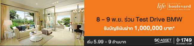 พบข้อเสนอพิเศษที่ ไลฟ์ บางกอก บูเลอวาร์ด ราชพฤกษ์-รัตนาธิเบศร์ จากเอสซี แอสเสท บ้านเดี่ยวคุณภาพใจกลางรถไฟฟ้า 2 สาย เปิดบ้าน ขนาดใหญ่ กว่า 100 ตร.ว. ใกล้คลับเฮ้าส์ 8-9 พ.ย. นี้ ร่วม Test Drive กับ BMW พร้อมรับบัญชีเงินฝากถึง 1 ล้านบาท บ้านราคาเริ่มที่ 5.99-9 ล้านบาท
